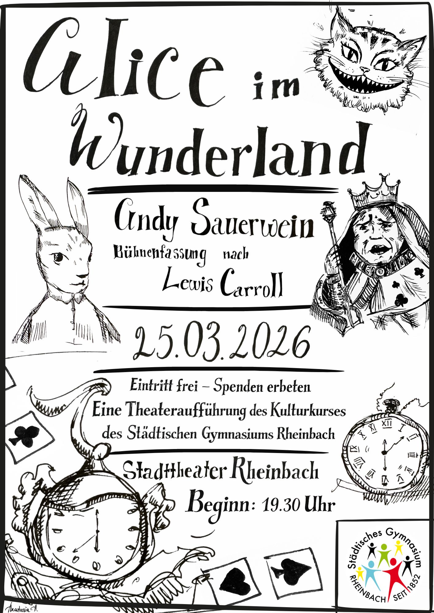 Der Kulturkurs der Jahrgangsstufe 10 präsentiert am 25.03., um 19.30Uhr, das Stück „Alice im Wunderland“ (Bühnenfassung von Andy Sauerwein, frei nach Lewis Caroll):