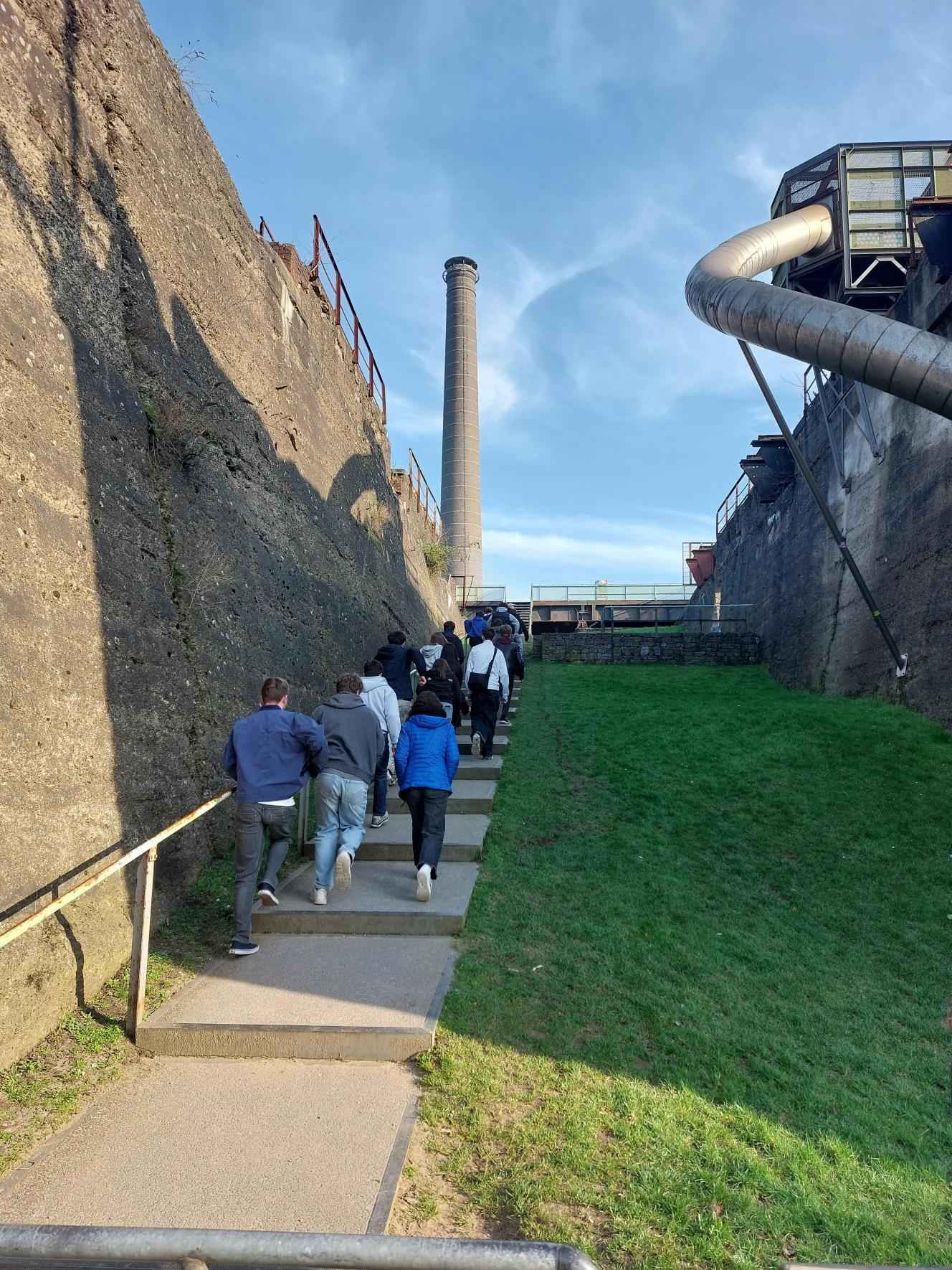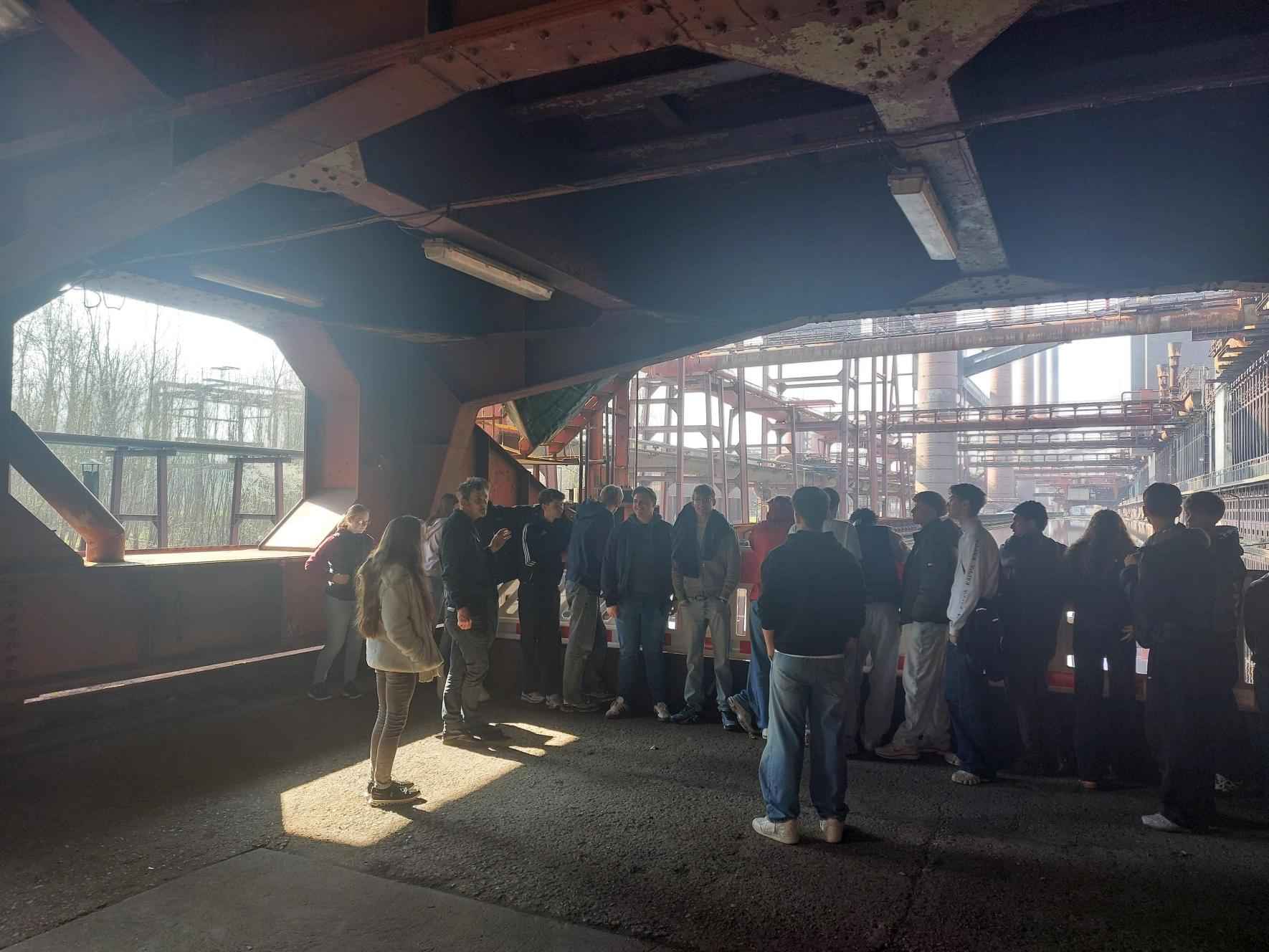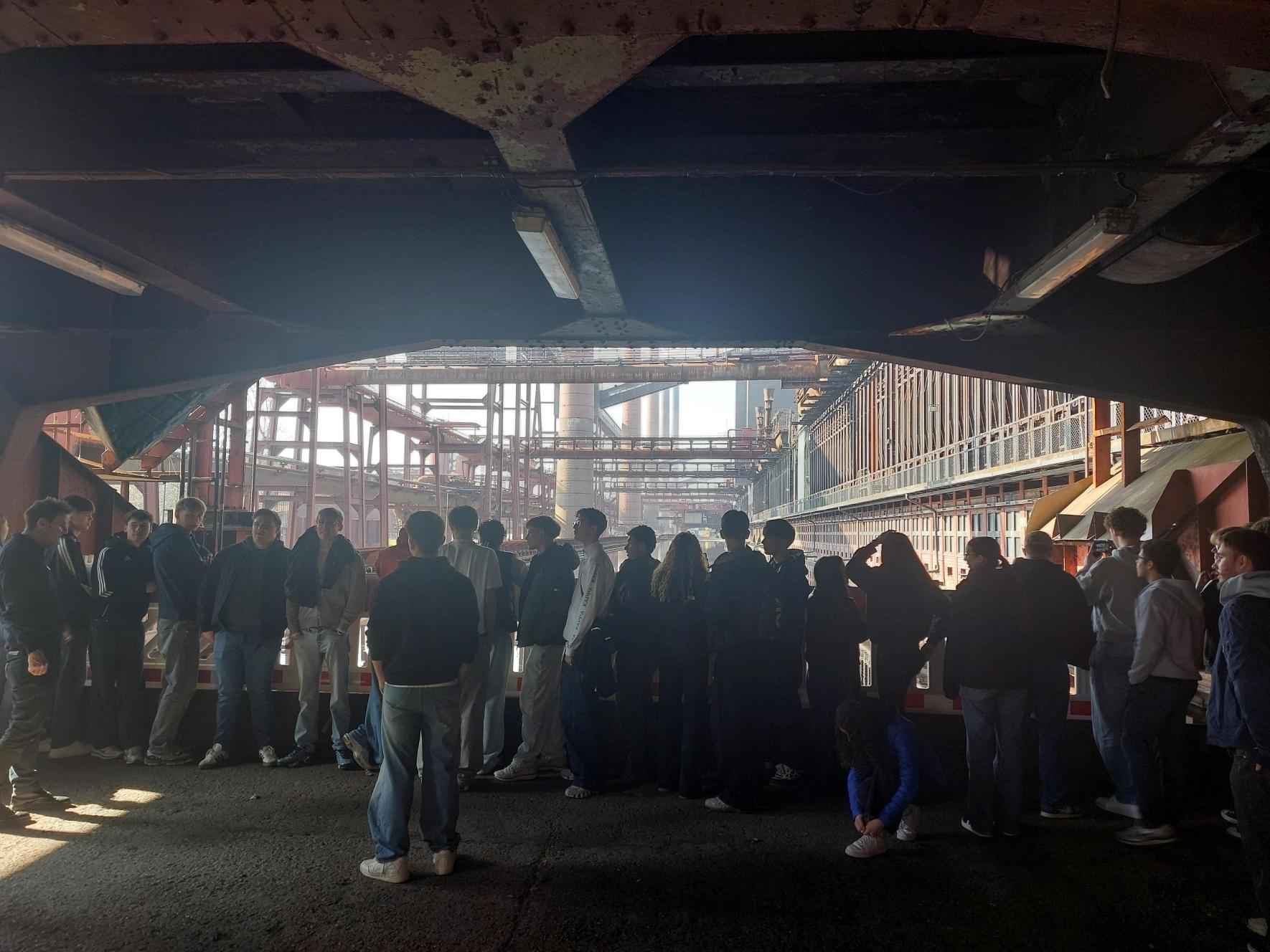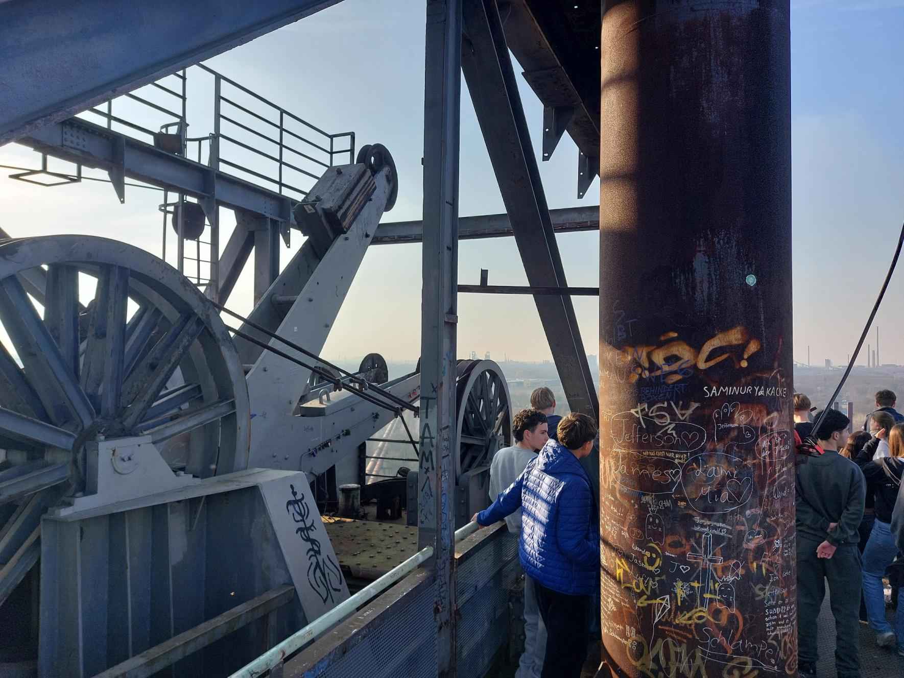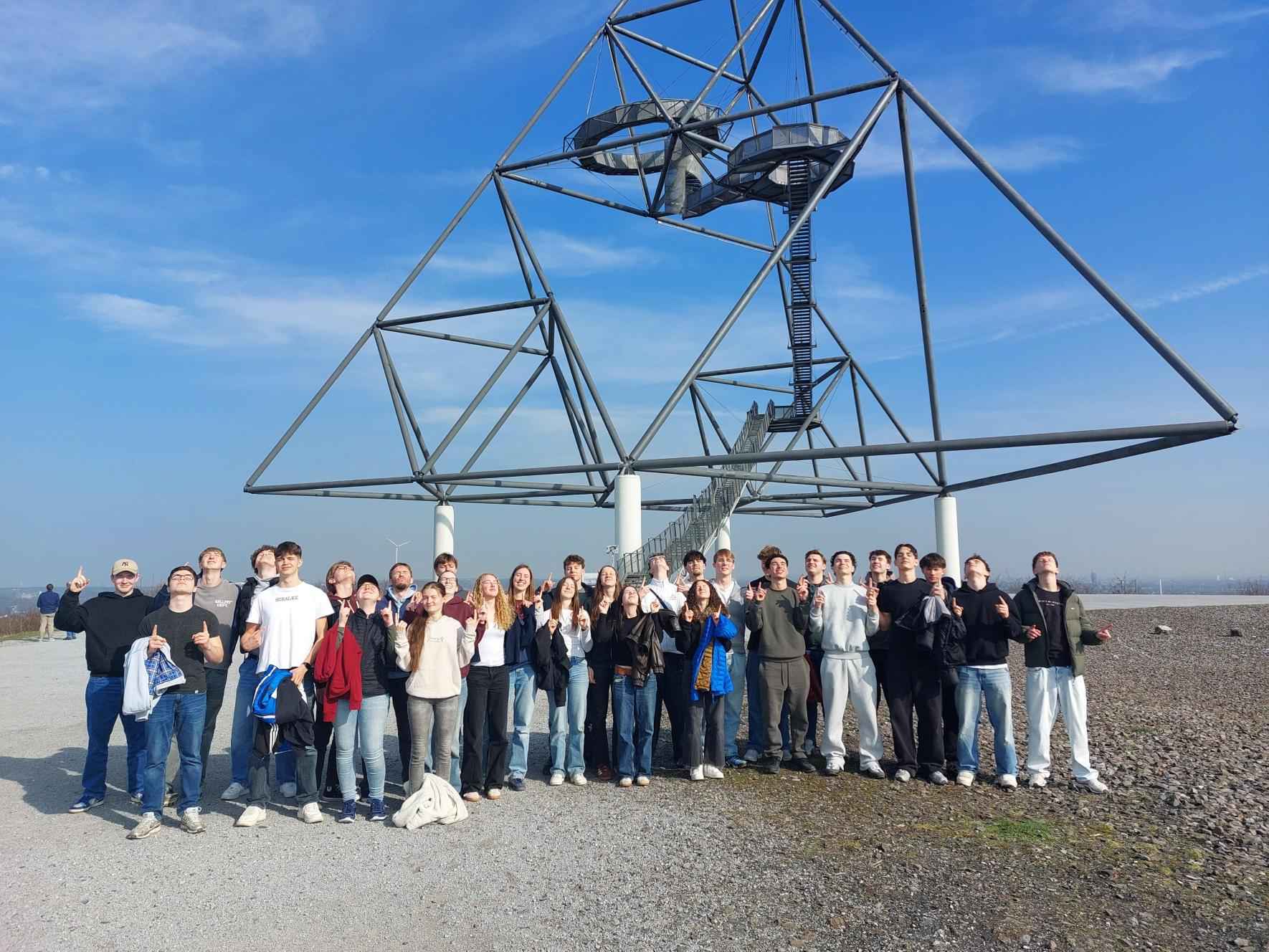 In Essen stieg Herr Niggemeier vom Regionalverband Ruhr zu unserer Gruppe in den Bus und führte uns anschließend durch die sogenannte Westtour. Mit vielen anschaulichen Beispielen erklärte er, wie sich das Ruhrgebiet von einer Region der Zechen und Hochöfen zu einem modernen Raum für Kultur, Freizeit und Dienstleistungen entwickelt hat. Ein besonders beeindruckender Halt war die Zeche Zollverein. Wo früher Kohle gefördert wurde, befinden sich heute Museen, Kulturorte und kreative Arbeitsräume – ein eindrucksvolles Symbol für den Wandel der Region. Danach ging es weiter zum Tetraeder in Bottrop. Nach dem Aufstieg wurden wir mit einem großartigen Blick über das Ruhrgebiet belohnt – bei strahlendem Sonnenschein ein echtes Highlight des Tages. Eine entspannte Pause legten wir anschließend im Westfield Centro in Oberhausen ein. In der Westfield Oase konnten wir etwas essen, uns ausruhen und die Eindrücke des Vormittags sacken lassen. Zum Abschluss stand noch ein besonders eindrucksvoller Ort auf dem Programm: der Landschaftspark Duisburg-Nord in Duisburg. Dort stiegen wir auf einen der ehemaligen Hochöfen, der heute als Aussichtsturm genutzt wird. Von etwa 70 Metern Höhe bot sich uns ein beeindruckender Blick über das riesige ehemalige Industriegelände – ein perfekter Abschluss für einen erlebnisreichen Tag.