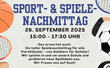 Sport- und Spielenachmittag 26. September – 15:00-17:30 Uhr Sport- und Spielenachmittag Das erwartet euch: Ein toller Spielenachmittag für alle Viertklässler – von Schülern für Schüler! Wir spielen in und um unsere Schule und probieren neue Spielideen aus. Wir freuen uns auf Euch! Bild: Joey 10b